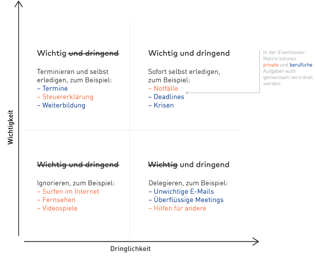 Die Eisenhower-Matrix lässt sich in der Praxis sehr einfach anwenden. Private als auch berufliche Aufgaben werden anhand der Kategorien „Wichtigkeit“ (wichtig/nicht wichtig) und „Dringlichkeit“ (dringend/nicht dringend) priorisiert und in eine Matrix überführt.