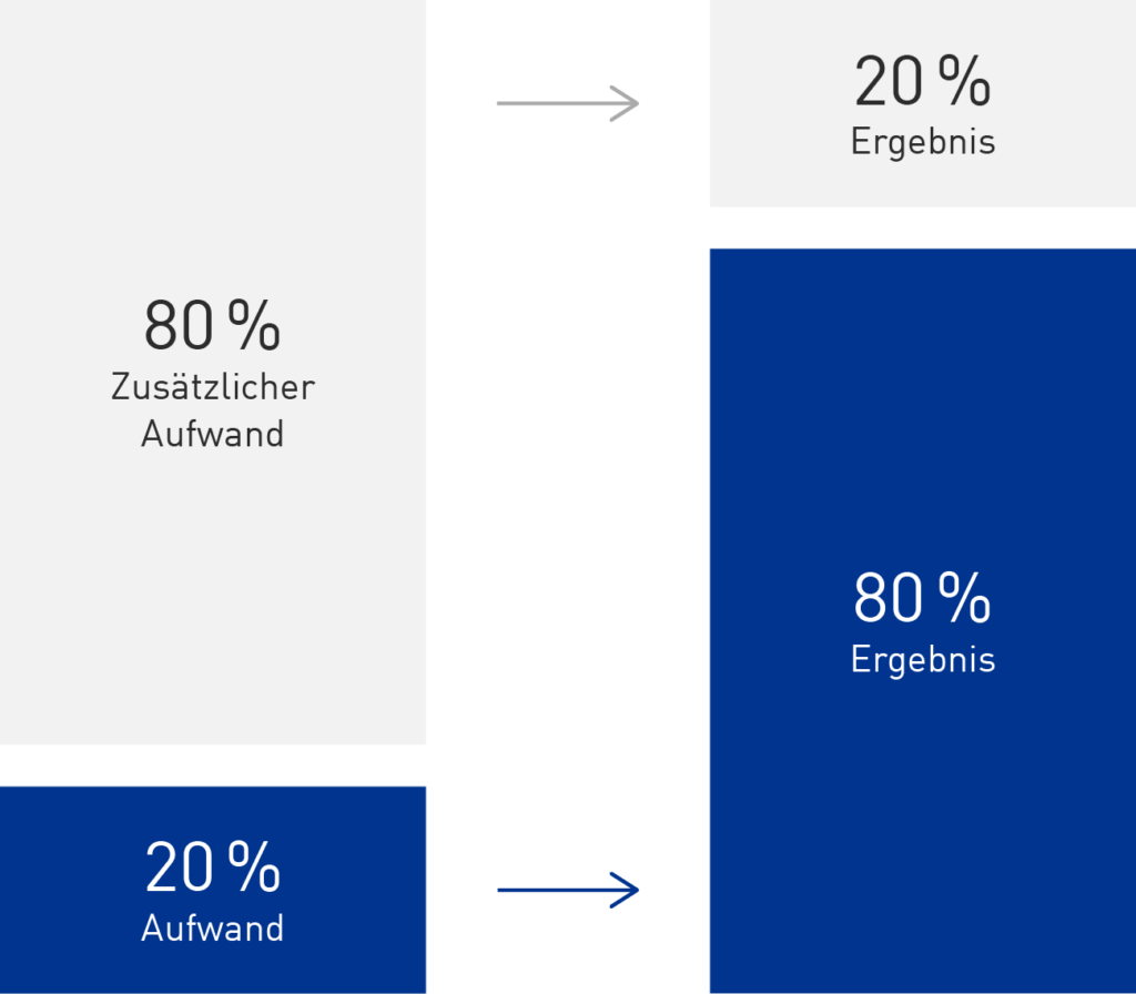 Je regelmäßiger du den Fokus-Blocker nutzt, desto leichter wird es dir fallen in den Flow-Zustand zu kommen. Die Methode steigert deine Produktivität und hilft dir durch den Pareto-Effekt deine Ziele schneller zu erreichen. Der Pareto-Effekt besagt, dass du mit 20% deines Arbeitseinsatzes bereits 80% des gewünschten Ergebnis erreichen kannst. Er verdeutlicht sehr anschaulich, weshalb der Fokus auf deine wichtigsten Aufgaben so effektiv ist (siehe Abbildung 1).